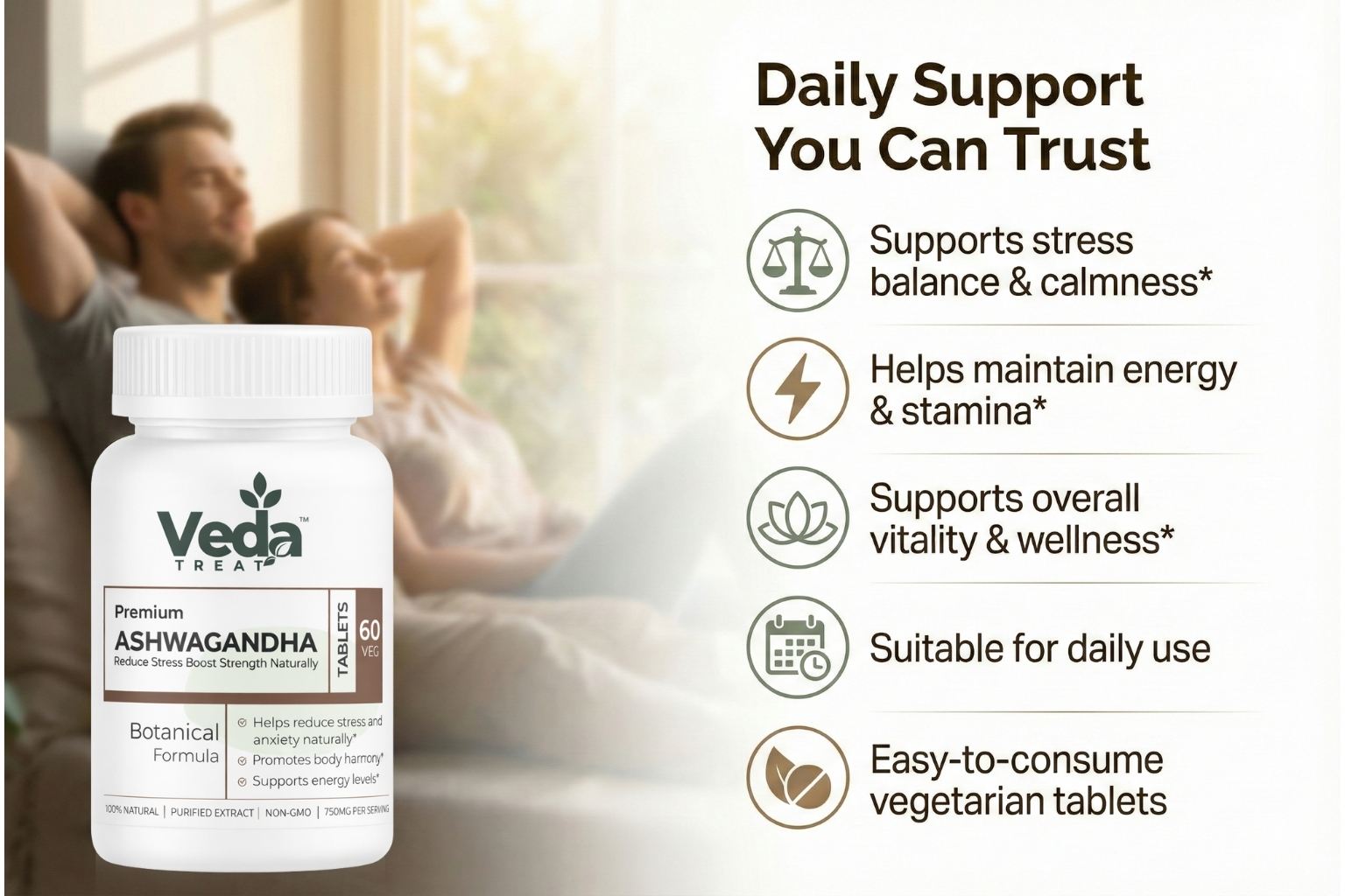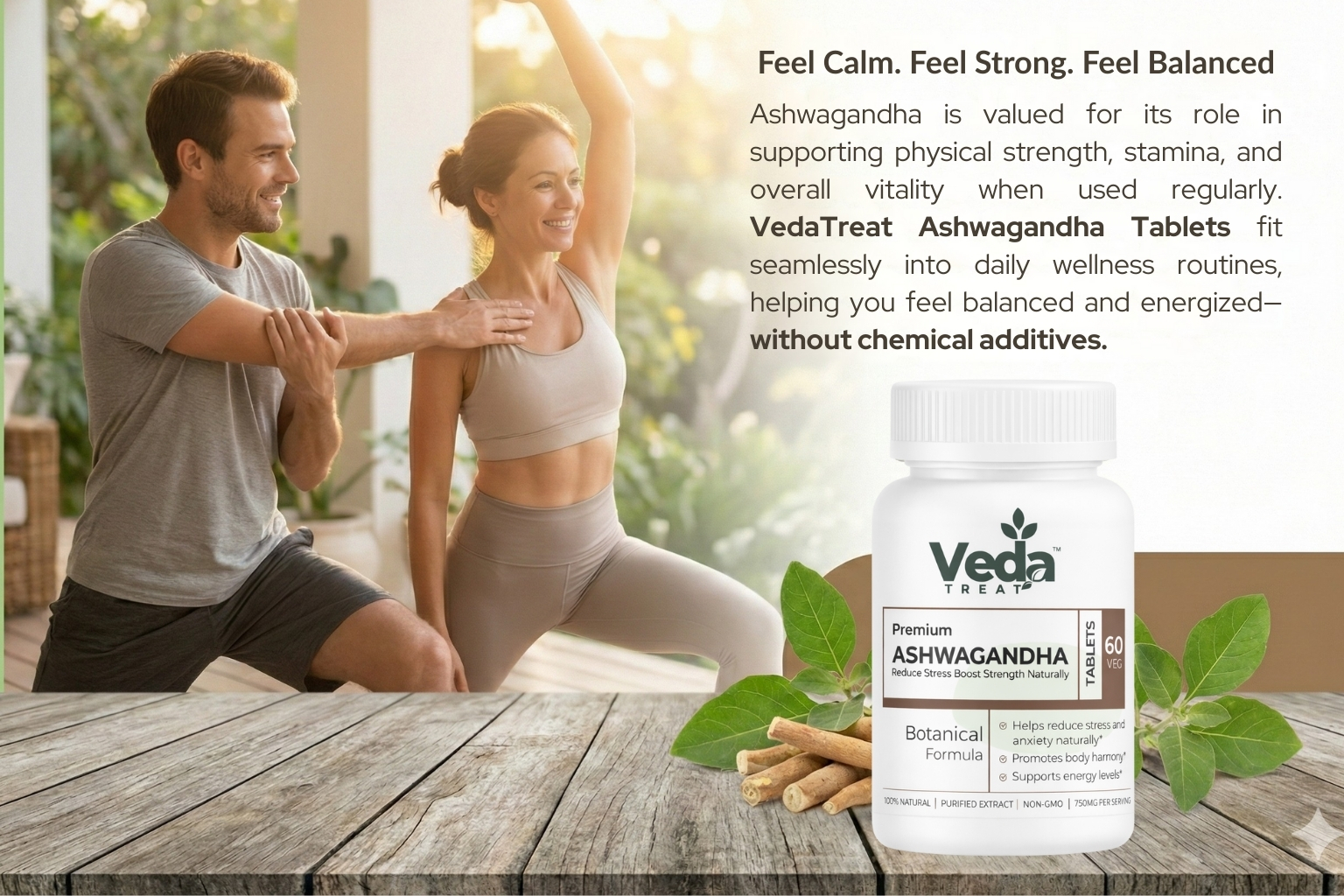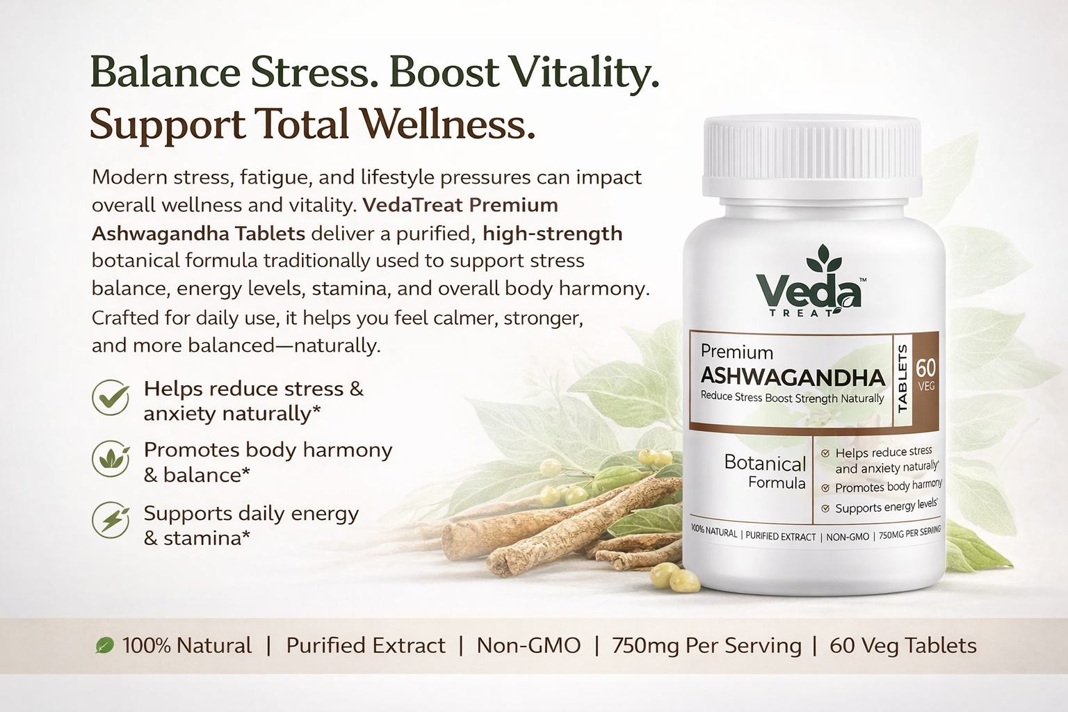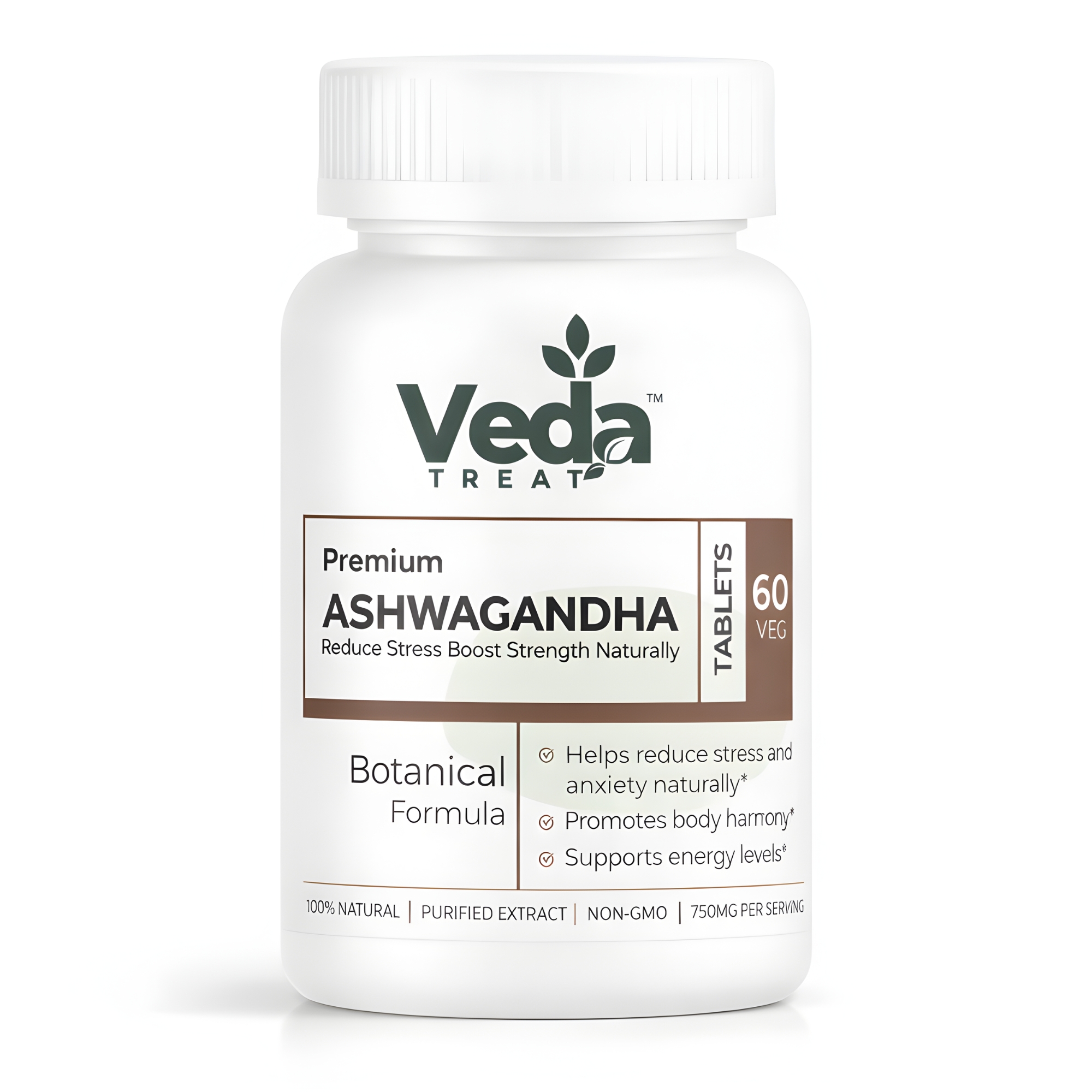 VedaTreat Premium Ashwagandha Tablets are designed to support your body and mind naturally.Each tablet contains 700 mg of high-quality Ashwagandha extract, a powerful Ayurvedic herb known to help the body adapt to stress, support calmness, and improve daily energy levels.With regular use, this natural supplement helps promote mental balance, physical strength, and overall well-being—perfect for busy professionals, fitness-focused individuals, and anyone managing a fast-paced lifestyle.Easy to take, gentle on the body, and made with trusted quality standards, VedaTreat Ashwagandha Tablets help you feel stronger, calmer, and more energized—naturally.